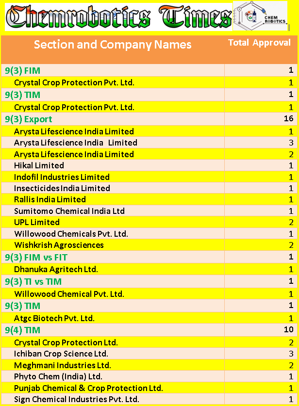 Ichiban Crop Science, Crystal Crop, Meghmani Industries, Phyto Chem (India), Punjab Chemical, Sign Chemical, and many more companies get approvals in different categories.