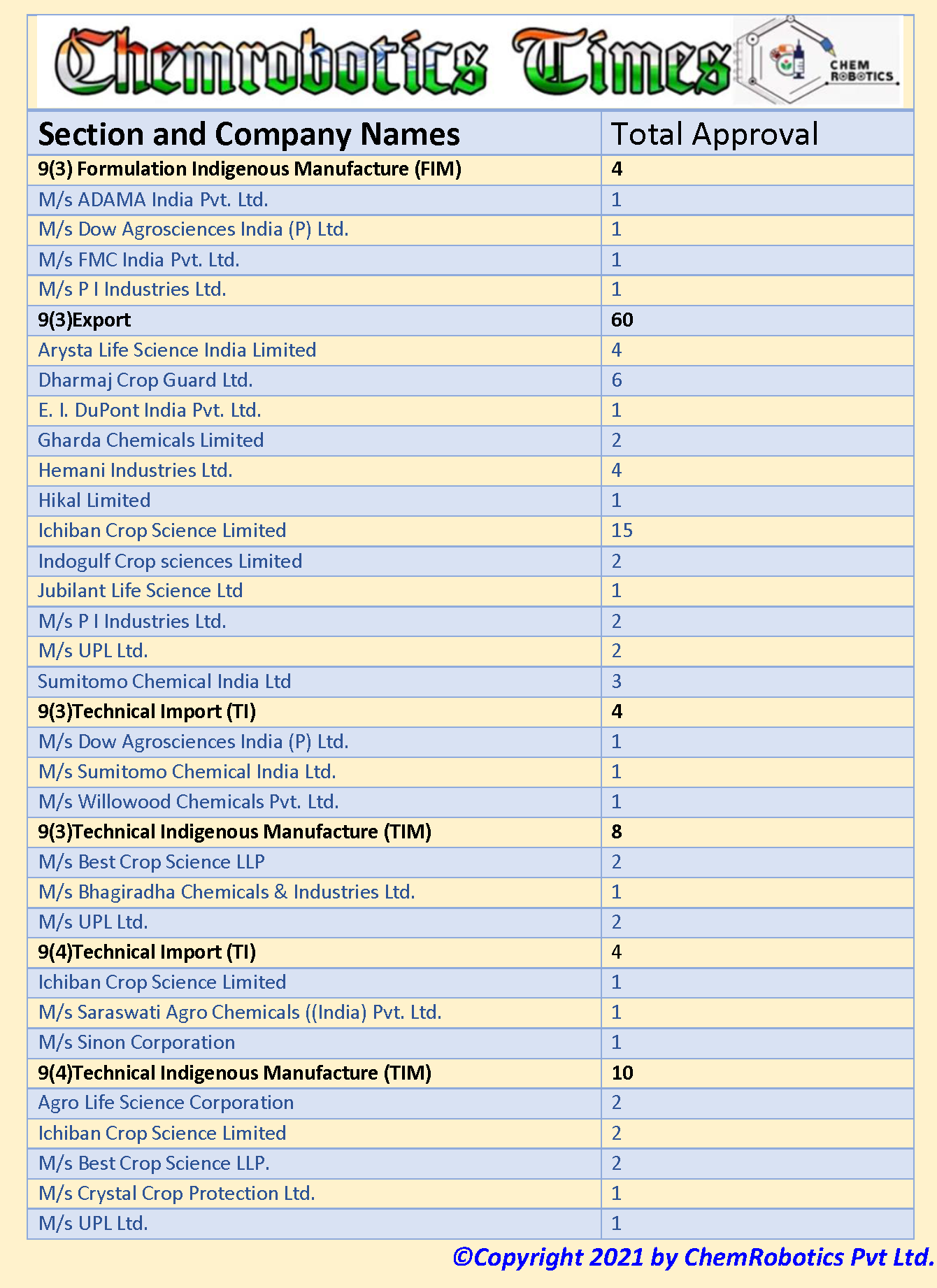 M/s BASF India Ltd., M/s Syngenta India Ltd, M/s Bayer Vapi Pvt. Ltd., M/s Crystal Crop Protection Ltd., M/s Insecticides India Ltd., M/s UPL Ltd., M/s P I Industries Ltd., M/s Coromandel International Ltd., M/s Prabhat Fertilizer and Chemical, M/s Aaria Bio-Lifesciences Research Pvt. Ltd., M/s Bharat Petroleum Corporation Ltd., M/s Parijat Industries (India) Pvt. Ltd., M/s FMC India Pvt. Ltd., M/s Aaria Bio-Lifesciences Research Pvt. Ltd. and many other companies got approvals in different categories.
