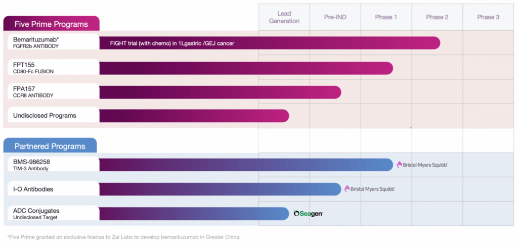 - Five Prime’s lead asset, Bemarituzumab, is a first-in-class, Phase 3 ready anti-FGFR2b antibody with positive data from a randomized, placebo-controlled Phase 2 study in frontline advanced gastric or gastroesophageal junction (GEJ) cancer. Bemarituzumab targets FGFR2b, which has been found to be overexpressed in approximately 30% of patients with non-HER2 positive gastric cancer, as well as other solid tumors.