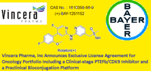 Under the terms of the license agreement, Vincera will in-license VIP152 (formerly BAY 1251152 & CAS RN.: 1610358-56-9), a clinical-stage, highly selective, positive transcription elongation factor b (PTEFb)/cyclin-dependent kinase 9 (CDK9) inhibitor for the treatment of cancer. Additionally, Vincera will receive assets and license technology for a preclinical bioconjugation platform to address the limitations of small-molecule and antibody-drug conjugates in oncology. The preclinical assets include VIP236, a small molecule drug conjugate (SMDC) targeting advanced and metastatic cancer; as well as VIP943 (formerly BAY-943) and VIP924 (formerly BAY-924), two antibody-drug conjugates (ADC) targeting hematologic tumors; and VIP217, an oral PTEFb/CDK9 inhibitor in discovery.